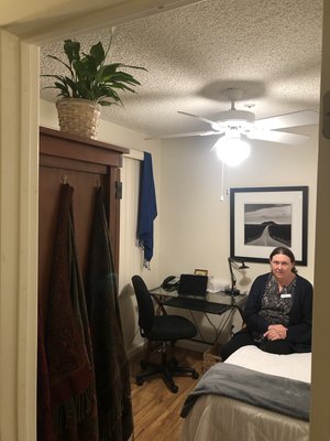 The economy room (111-3) has a shared bathroom, a wardrobe, no mirror, a twin bed with memory foam, no TV, a very nice computer desk and a full length window that looks out on the courtyard. The safe in the room does not work. It has its own wall heater. The cost for this room is $169 a night. Of the three rooms this is the one I am in and like the most. It is my cave, cozy, and gives me the vantage point of watching the interactions that go on in the courtyard. I have also ‘decorated’ it with my shawls, a plant and a throw cover that I can snuggle up in. It is very pleasant. I will have to move from this room to another room in about a week as I had to be shifted around so I could stay the needed number of days. All in all I am happy with it and if I should EVER do this again. This is the room I would pick.