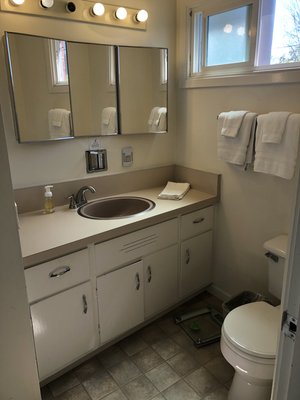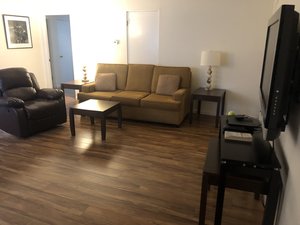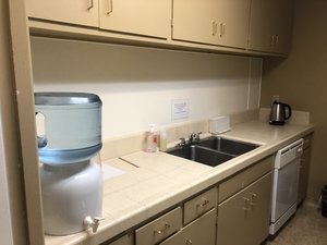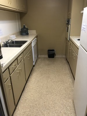 The common areas. There is a couch, lounge chair, TV and DVD player, a table and chairs. It is quite a large area. This building used to be an apartment building. There is a full kitchen in the 70’ style, and the shared bath. The kitchen is NEVER used as kitchen. It holds the water dispenser on the counter. There is one in the fridge and ice packs in the freezer. There is also an electric tea pot if you should want to drink hot water. And believe me some have, including me.