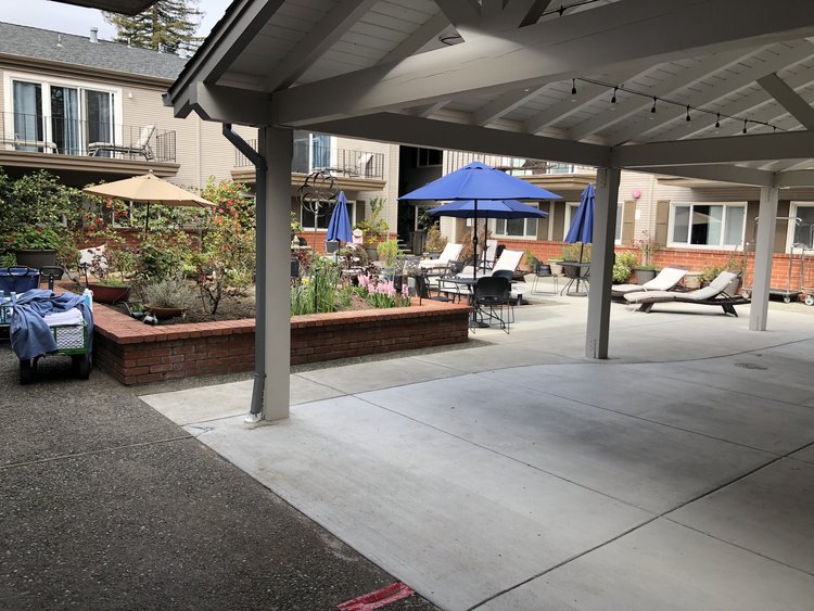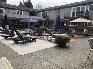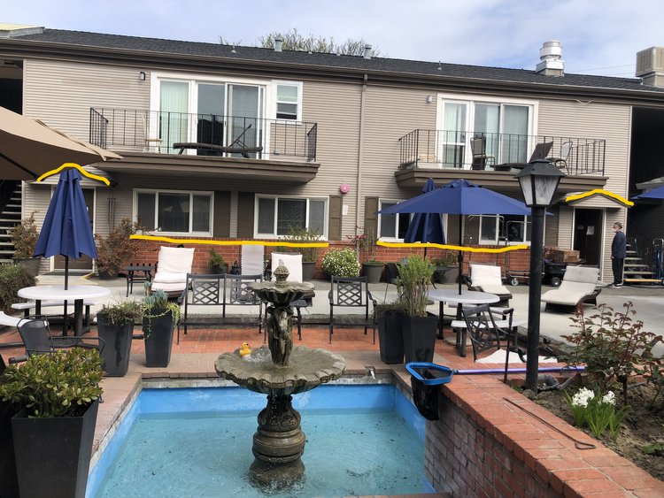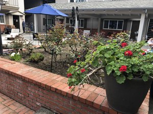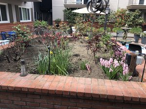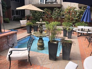 The courtyard. It has a fountain, a large raised flower bed with roses planted in it, These should bloom before I leave. Lots of lounge chairs and other types of chairs to sit in. Tables with umbrellas and lots of space to walk around the edges. It is a very nice area.