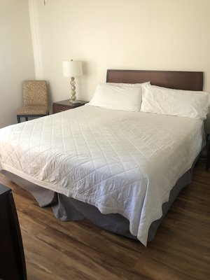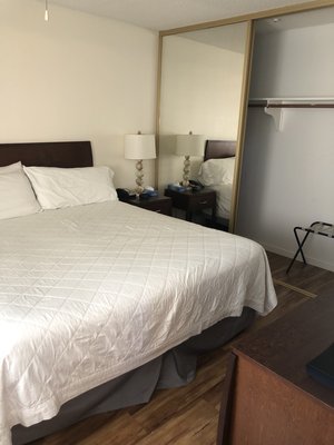 The deluxe room (111-1) has its own bathroom, full closet with mirrored doors, queen size sleep number bed, TV with Comcast and Netflix, dresser, desk, a safe, and a full length window. The cost for this room is $249 a night.