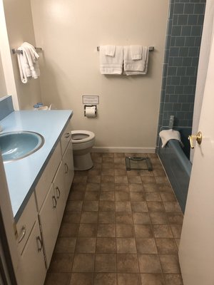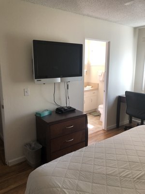 The standard room (111-2) has a shared bathroom, half closet with mirrored doors, full size sleep number bed, TV with Comcast and Netflix, dresser, desk, a safe, and a full length window. The cost for this room is $209 a night. This is the room Dani and I stayed in for 4 nights.
